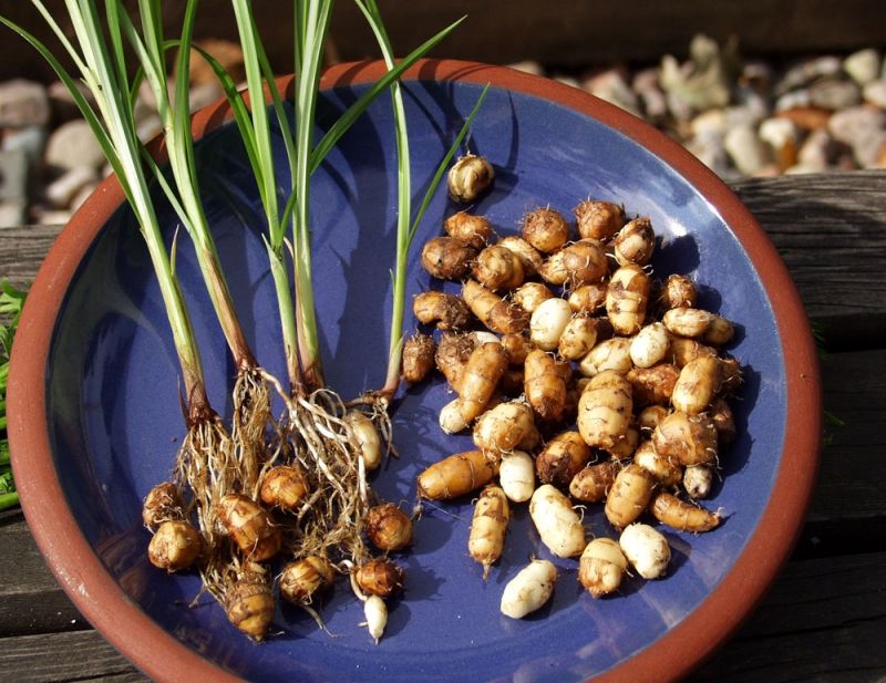 Från 1200-talet. Detta är ett halvgräs som bildar små, köttiga rotknölar vilka man äter. De har en söt, nötliknande smak. Man skördar dem på hösten och de kräver en väldigt varm växtplats, gärna i kruka, full sol eller växthus!
